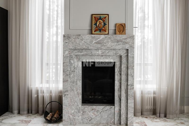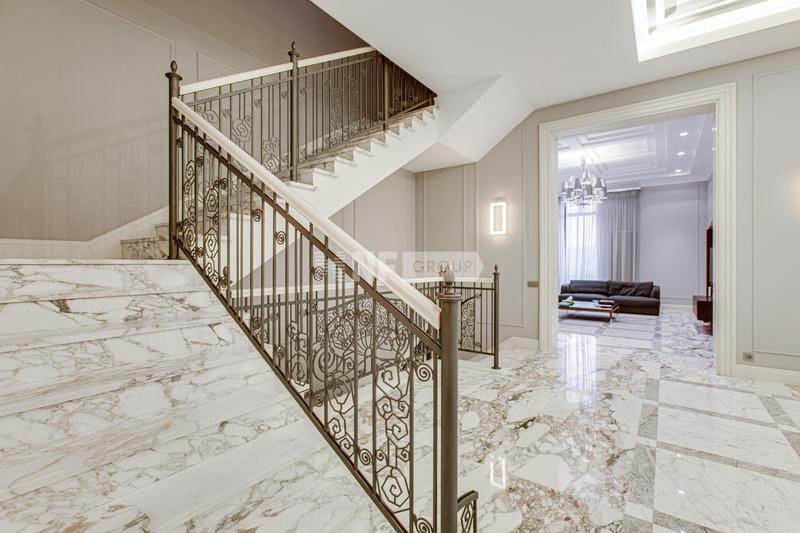 Дизайн интерьера выполнен в стиле современной классики, с использованием высококачественных материалов. Пол на первом этаже выполнен из натурального мрамора, второй этаж и мансарда - паркетная доска, цоколь - керамогранит, паркетная доска. Подоконники на первом этаже из натурального мрамора, в жилых помещениях – деревянные. Лестница марш монолит, ступени лестничного марша отделаны натуральным мрамором, балюстрада – художественная ковка.